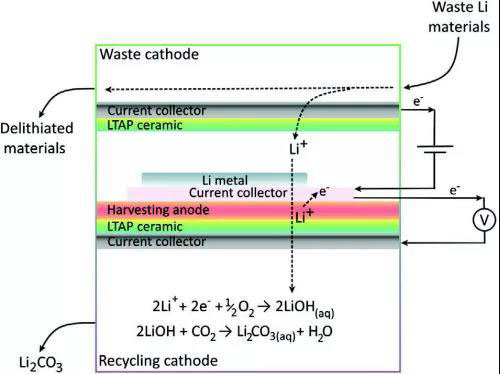 在封閉的電化學(xué)系統(tǒng)中實(shí)現(xiàn)了一種創(chuàng)新的嵌入式解決方案,用于從廢舊LIBs中回收鋰(圖9)。該廢料制鋰系統(tǒng)基于室溫下的電化學(xué)反應(yīng),使用三個(gè)功能部分進(jìn)行操作。兩個(gè)正極室,一個(gè)用于廢料,一個(gè)用于回收回收的鋰,以及一個(gè)位于兩個(gè)正極室之間收集鋰的負(fù)極室。充電后,Li+從廢物中提取出來(lái),并在負(fù)極收集室還原為鋰金屬。所獲得的金屬純度為99%,此時(shí)可以將其從系統(tǒng)中提取,或隨后與水進(jìn)一步反應(yīng)以產(chǎn)生高純度的LiOH和Li2CO3。與現(xiàn)有的鋰回收技術(shù)相比,這種可持續(xù)性系統(tǒng)的優(yōu)勢(shì)是無(wú)需酸、可擴(kuò)展性以及在室溫下可能的運(yùn)行。