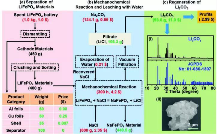 在LIBs回收中一個(gè)經(jīng)常被忽視的問(wèn)題是:如何使鋰真正進(jìn)入電極?W?chter等通過(guò)確保在非導(dǎo)電金屬氧化物上形成納米級(jí)均勻的碳涂層,提供了一種創(chuàng)新的解決方案。利用Li2C2和V2O5之間的拓?fù)涔虘B(tài)反應(yīng),在鋰化的正極材料LixV2Oy上形成了幾納米厚的碳涂層。原位涂覆的碳確保了導(dǎo)電性,防止了顆粒團(tuán)聚,同時(shí)無(wú)需使用溶劑即可將鋰嵌入電池中。LiFePO4正極的近無(wú)溶劑回收利用的優(yōu)勢(shì)是最近在LiFePO4/碳粉和NaCl作為共研磨劑的機(jī)械固相反應(yīng)中實(shí)現(xiàn)的。LiFePO4晶體中的Li與Na同構(gòu)取代,從而實(shí)現(xiàn)了LiFePO4正極的無(wú)溶劑回收。通過(guò)技術(shù)經(jīng)濟(jì)估算,每回收1千克LiFePO4可獲得3美元的利潤(rùn);此外,沒(méi)有多余的化學(xué)物質(zhì)暴露于環(huán)境之外(圖8)。