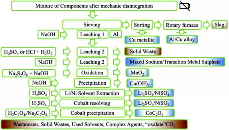 阿爾托大學(xué)開(kāi)發(fā)的實(shí)驗(yàn)室工藝包括改進(jìn)了經(jīng)典的火法和濕法冶金子工藝,在廢舊LIBs成分的總回收率達(dá)到99%(圖6)。該工藝報(bào)告達(dá)到了關(guān)鍵原材料的高回收水平,但由于其復(fù)雜性和大量使用的化學(xué)品,而沒(méi)有解釋副產(chǎn)品和廢物的處理方式,因此可能會(huì)限制其規(guī)模化和工業(yè)化以替代現(xiàn)有工藝的可持續(xù)發(fā)展。