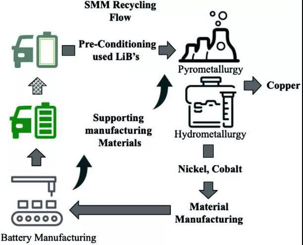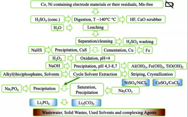 住友金屬礦業(yè)(SMM)開(kāi)發(fā)的原始“電池到電池”工藝的目標(biāo)是回收含鎳、鈷和銅基金屬成分的電極材料(圖4)。應(yīng)該注意的是,現(xiàn)有文獻(xiàn)中沒(méi)有描述幾個(gè)預(yù)處理步驟。由于沒(méi)有有關(guān)輔助材料回收、環(huán)境保護(hù)和廢物處理策略的信息,因此無(wú)法確定性地評(píng)估SMM過(guò)程的循環(huán)可持續(xù)性。