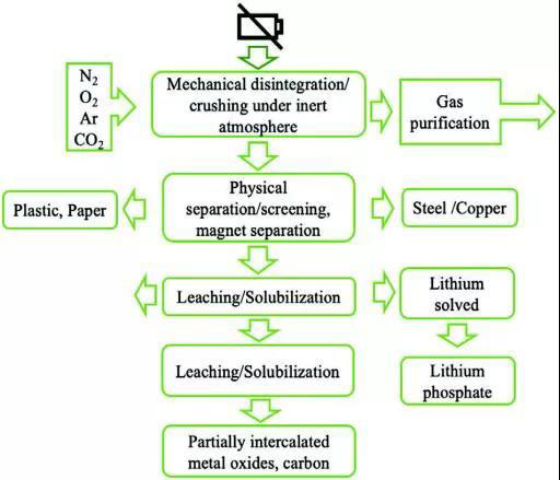 火法冶金是從礦石和二次資源中提取金屬的一套公認(rèn)的高溫工藝,即煅燒、焙燒、氧化還原或熔煉,這些過(guò)程會(huì)導(dǎo)致被加工材料的化學(xué)和物理性質(zhì)及形態(tài)發(fā)生變化。熱處理通常得到三種主要產(chǎn)物:金屬合金組分、熔渣和氣體。金屬合金組分,通常由過(guò)渡金屬(如鈷、鎳或鐵)組成,這取決于電池組分,在大多數(shù)情況下定向用于濕法冶金精煉工藝。電池中的所有鋰與其他金屬(如鋁和錳)一起消失在熔渣中,無(wú)法通過(guò)熱處理提取。因此,從爐渣中回收鋰的下一步也要進(jìn)行濕法冶金。在較低溫度(高達(dá)250℃)下熱冶金處理過(guò)程中形成的氣體主要由電解液中的揮發(fā)性有機(jī)化合物組成,而在較高溫度下,粘合劑組分和電極材料分解釋放出氣體。雖然廢舊LIBs的熱處理是過(guò)渡金屬回收的一種常見(jiàn)且相對(duì)有效的方法,但它需要大量的能量投入?;鸱ㄒ苯鸬牧硪粋€(gè)缺點(diǎn)是在粘合劑、電解液等燃燒過(guò)程中排放有毒氣體。一般來(lái)說(shuō),火法冶金提供的材料可能更多地被歸類(lèi)為半成品,而不是準(zhǔn)備再利用的產(chǎn)品,在廢舊LIBs的回收周期結(jié)束之前仍然需要精煉或加工。在許多工業(yè)回收過(guò)程中,通常采用混合的火法和濕法冶金處理方法,以盡量減少這些缺點(diǎn)。