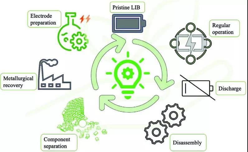 目前的LIBs回收技術(shù)主要集中在無(wú)機(jī)化學(xué)基礎(chǔ)和傳統(tǒng)技術(shù)上??沙掷m(xù)的回收過(guò)程不僅應(yīng)減少有毒化學(xué)物質(zhì)對(duì)環(huán)境的污染,而且還應(yīng)包括對(duì)CO2的處理。考慮到電池是多組分系統(tǒng)的事實(shí),必須從產(chǎn)生有害的化學(xué)化合物以及伴隨能耗的角度考慮所有熱處理。因此,LIBs回收背后的化學(xué)作用應(yīng)基于整個(gè)回收和價(jià)值鏈的綜合方法,以便被認(rèn)為是真正可持續(xù)的。根據(jù)這些論點(diǎn),本節(jié)總結(jié)了用于回收LIBs單個(gè)組分的可持續(xù)化學(xué)方法的最新進(jìn)展。