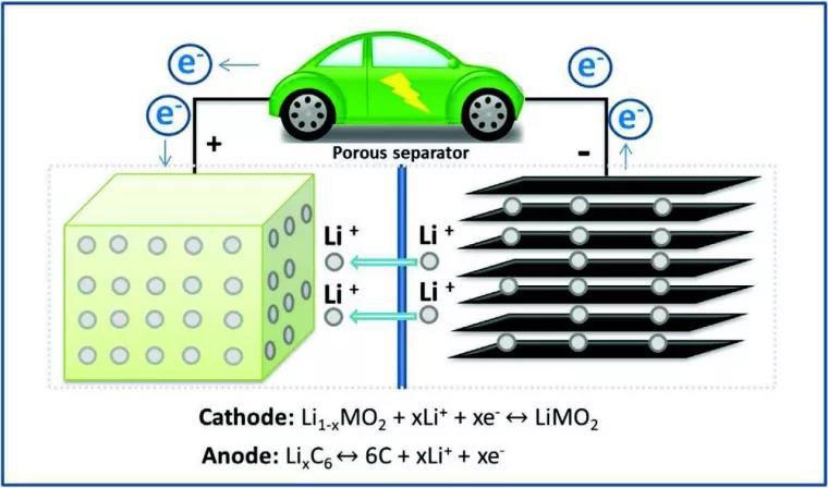 鋰的輕摩爾重量和低氧化還原電位促使研究人員對(duì)鋰金屬負(fù)極電池技術(shù)進(jìn)行歷史性研究。采用鋰金屬作為負(fù)極的鋰電池技術(shù),如Li/MnO2和Li/Ag2V4O11,在20世紀(jì)70年代已經(jīng)商業(yè)化。Goodenough及其同事在20世紀(jì)80年代首次展示了已鋰化的正極材料(在放電狀態(tài)下)的使用。對(duì)于早期的可充電鋰電池來(lái)說(shuō),鋰枝晶在長(zhǎng)時(shí)間循環(huán)中的增長(zhǎng)導(dǎo)致容量損失、短路和最終的爆炸危險(xiǎn)是一個(gè)巨大的安全問(wèn)題。在負(fù)極部分使用插層材料,可以通過(guò)在負(fù)極上以離子狀態(tài)沉積鋰來(lái)防止枝晶生長(zhǎng)。這種搖椅式鋰離子電池得到了許多科學(xué)家的貢獻(xiàn),并最終形成了C/LiCoO2搖椅電池的商業(yè)化。圖1顯示了LIBs的示意圖和工作原理。典型的鋰離子電池由兩種電極材料組成,鋰離子可以以可逆的方式前后插入其中。通常將鋰鹽(例如LiPF6)溶解在有機(jī)溶劑(例如EC: DMC)中作為電解液。與傳統(tǒng)的二次電池相比,鋰離子電池具有能量密度高、循環(huán)壽命長(zhǎng)、無(wú)記憶效應(yīng)、自放電率低等優(yōu)點(diǎn)。