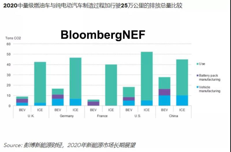 中國儲能網(wǎng)訊:新能源汽車行駛時無尾氣排放,但在制造和行駛過程中仍有相關排放。部分國家的監(jiān)管機構(gòu)考慮對純電動汽車(BEV)和燃油車(ICE)全生命周期內(nèi)二氧化碳排放的可能性。本報告中,BNEF提出了到2040年美國、中國、英國、德國和法國的新能源汽車和燃油車使用過程和全生命周期排放量的估算。