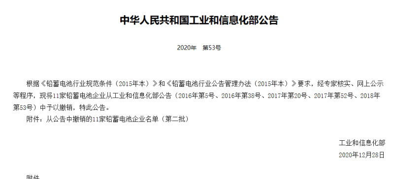 工信部:11家鉛蓄電池企業(yè)從工業(yè)和信息化部公告中予以撤銷