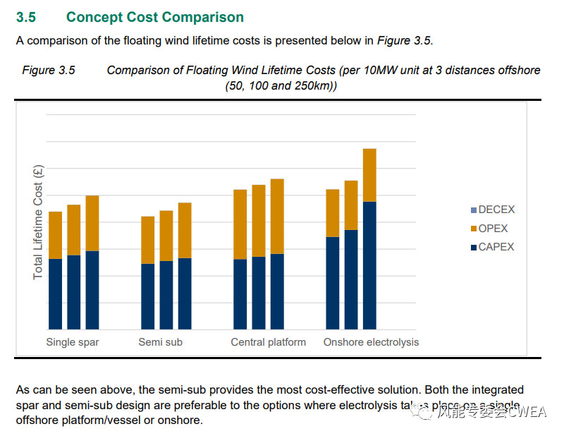 其中兩臺(tái)自帶電解槽的漂浮式風(fēng)機(jī),使用不同的漂浮式基礎(chǔ),一個(gè)是單柱式漂浮式海上基礎(chǔ),一個(gè)采用半潛式漂浮式基礎(chǔ)。第三個(gè)方案使用海上中央平臺(tái)制氫,第四個(gè)只是簡單地將電力輸送到岸上電解槽制氫。