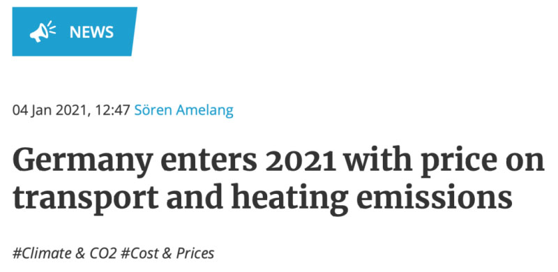 據(jù)法新社報(bào)道,進(jìn)入2021年,德國加大應(yīng)對(duì)氣候變化的力度,在運(yùn)輸和取暖方面實(shí)施全國性的二氧化碳價(jià)格,適用于汽油、柴油、取暖油和天然氣等燃料。
