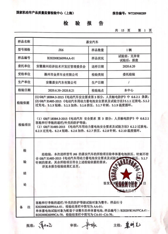 2020年8月28日,受安徽滁州經(jīng)濟技術開發(fā)區(qū)管理委員會委托,國家機動車產(chǎn)品質(zhì)量監(jiān)督檢驗中心(上海)出具了嘉安汽車《檢驗報告》。檢驗報告顯示,所檢項目除單體蓄電池擠壓、針刺不符合相關要求外,其余所檢測項目均符合相關標準。