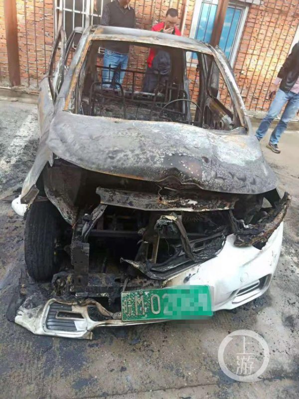▲2019年10月26日,安徽全椒縣一輛嘉安汽車因電池自燃被燒毀。圖片來源/受訪者供圖