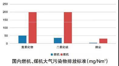 二是污染物排放少。由于天然氣燃燒過(guò)程中只會(huì)生成二氧化碳和水,沒(méi)有粉塵和硫化物排放,更沒(méi)有燃煤粉塵中的重金屬污染,屬于清潔能源。只有空氣中的少量氮?dú)庠谌紵龝r(shí)被氧化為NOx,其排放標(biāo)準(zhǔn)也是大幅低于燃煤機(jī)組。根據(jù)火電廠大氣污染物排放標(biāo)準(zhǔn)(GB 13223-2011),國(guó)內(nèi)燃機(jī)和煤機(jī)大氣污染物排放標(biāo)準(zhǔn)如圖所示。