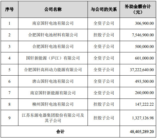 1月7日晚,國軒高科發(fā)布公告稱,公司子公司2020年10-12月份累計收到與收益相關(guān)政府補助資金合計人民幣4840.53萬元,具體如下: