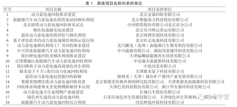 2019年7月,京津冀三地工業(yè)與信息化部門聯(lián)合發(fā)布了《關(guān)于公布京津冀地區(qū)新能源汽車動(dòng)力電池回收利用試點(diǎn)示范項(xiàng)目名單的通知》,共有18個(gè)項(xiàng)目列入試點(diǎn)示范項(xiàng)目名單,具體項(xiàng)目名稱和承擔(dān)單位如表1所示。