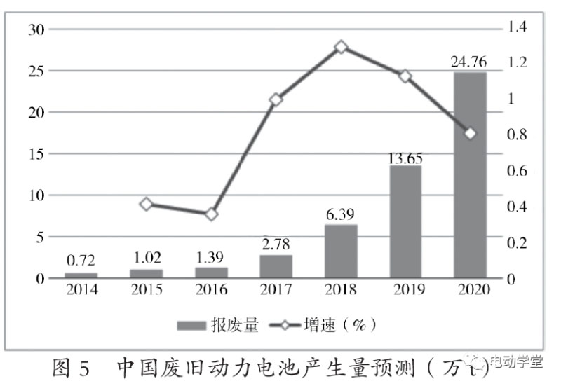 當(dāng)新能源汽車動(dòng)力電池容量衰減至低于80%時(shí),動(dòng)力電池就無(wú)法滿足電動(dòng)汽車的動(dòng)力需求,動(dòng)力電池就需要進(jìn)行報(bào)廢處置。一般動(dòng)力電池的使用壽命為5~8年,這意味著動(dòng)力電池往往先于新能源汽車的報(bào)廢。通常,人們根據(jù)新能源汽車銷售量增長(zhǎng)幅度和趨勢(shì)、動(dòng)力電池使用壽命來(lái)預(yù)測(cè)廢鋰離子電池產(chǎn)生量。中國(guó)產(chǎn)業(yè)信息網(wǎng)預(yù)測(cè)了中國(guó)廢舊動(dòng)力電池回收的產(chǎn)生量,如圖5所示。從圖中可以看出,2019年退役動(dòng)力電池為13.65萬(wàn)t,2020年退役量為24.76萬(wàn)t。