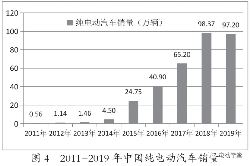 根據(jù)中國(guó)汽車工業(yè)協(xié)會(huì)數(shù)據(jù),2019年我國(guó)純電動(dòng)汽車產(chǎn)量102萬(wàn)輛,同比增長(zhǎng)3.4%,銷量完成97.2萬(wàn)輛,同比下降1.2%。2011-2019年,中國(guó)純電動(dòng)汽車產(chǎn)銷量如圖3和圖4所示。