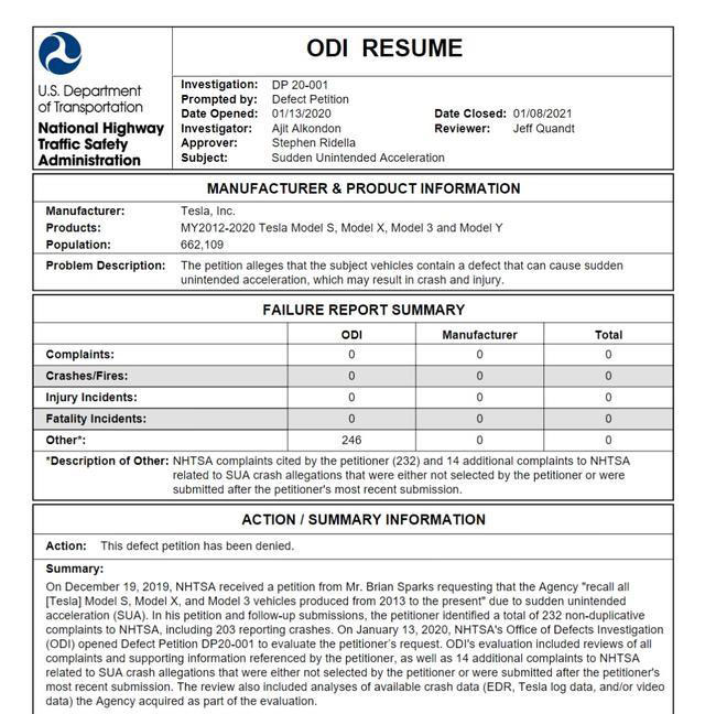該機構(gòu)于 2019 年 10 月收到一份請愿書,希望針對特斯拉 2012-2020 年生產(chǎn)的 Model S、Model X、Model 3、Model Y 車型展開調(diào)查,這一批車輛共計 66.2 萬輛。請愿書懷疑這些車輛有著突然自動加速的故障。NHTSA 調(diào)查了 232 起不重復(fù)的投訴,其中包含 203 起事故。在 2020 年 1 月 13 日,該機構(gòu)缺陷調(diào)查辦公室(ODI)依據(jù)請求展開了這項調(diào)查,審核人員分析了相關(guān)車輛的日志數(shù)據(jù)和車內(nèi)視頻。