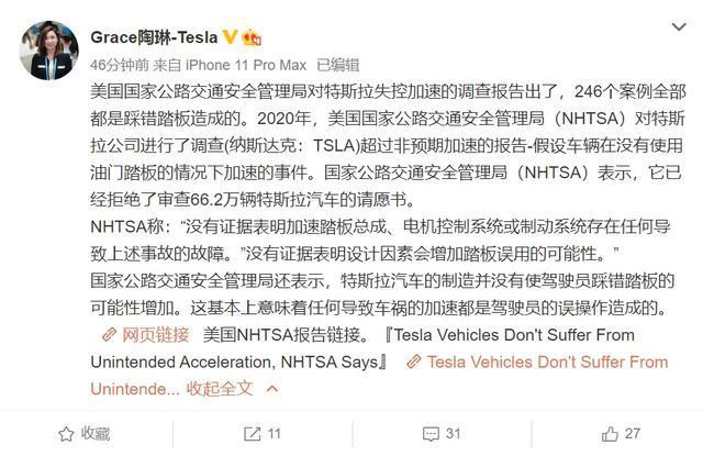 1月9日消息 特斯拉中國對外事務(wù)副總裁陶琳在微博發(fā)布消息,稱美國國家公路交通安全管理局(NHTSA)發(fā)布了對特斯拉失控加速的調(diào)查報告。根據(jù)報告顯示,246 個案例全部為踩錯踏板造成。