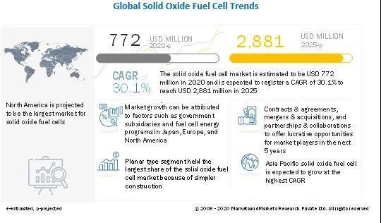 中國儲(chǔ)能網(wǎng)訊:根據(jù)國際市場研究機(jī)構(gòu)Markets and Markets日前發(fā)布的報(bào)告,預(yù)計(jì)全球固態(tài)氧化物燃料電池市場規(guī)模將從2020年的7.72億美元增長至2025年的28.81億美元,復(fù)合年增長率為30.1%。
