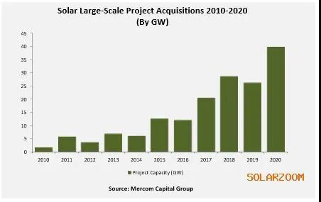 到2020年,有231個(gè)大型太陽能項(xiàng)目并購交易,而2019年為192筆交易。2020年,創(chuàng)紀(jì)錄的39.5吉瓦大型太陽能項(xiàng)目易手,而2019年為26.1吉瓦。這是迄今為止單年度獲得的最大項(xiàng)目數(shù)量。
