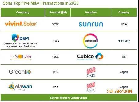 2020年,太陽能領(lǐng)域完成了62項(xiàng)并購交易,而2019年為65項(xiàng)。大多數(shù)交易涉及太陽能下游企業(yè)。2020年最大的一筆交易是Sunrun以32億美元的全股票交易收購了Vivint Solar。