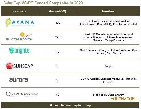 2020年獲得風(fēng)險(xiǎn)投資最多的公司是Ayana Renewable Power,籌集了3.9億美元;Silicon Ranch Corporation,籌集了2.25億美元;Brighte籌集了7600萬美元;Sunseap Group籌集了7200萬美元;Aurora Solar和Zero Mass Water各自籌集了5,000萬美元。