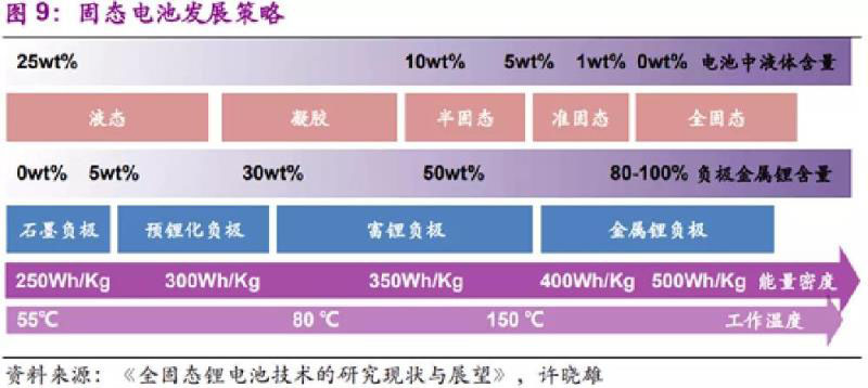 從下面這張表能看出,固態(tài)電池不是一蹴而就,而是有一個逐步進(jìn)化的過程。電池中的液體含量,從25%一路下降到0%,能量密度從250Wh/kg一路升到500Wh/kg以上,是一個個循序漸進(jìn),從液態(tài)、凝膠、半固態(tài)向準(zhǔn)固態(tài)、全固態(tài)電池的進(jìn)化升級過程。