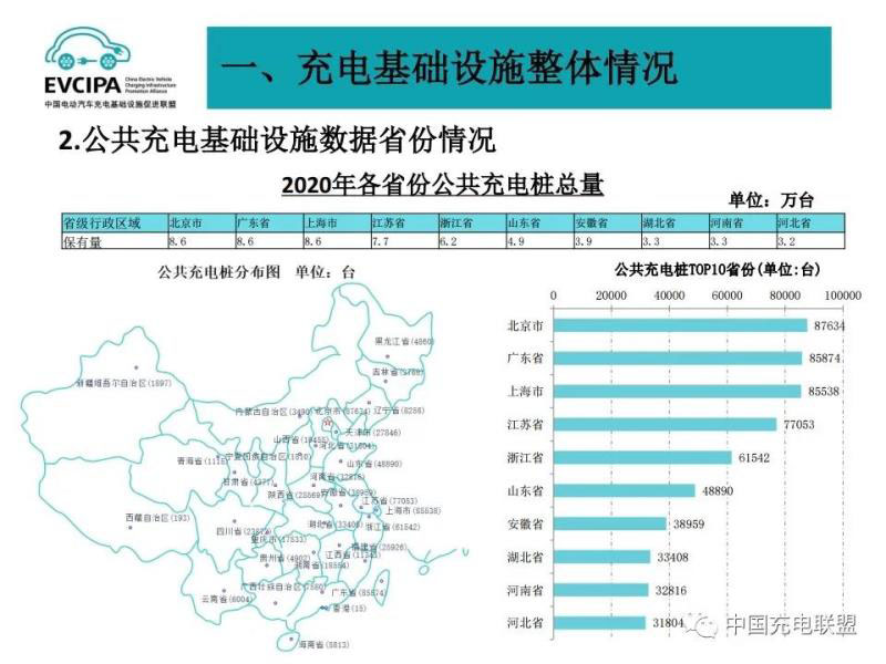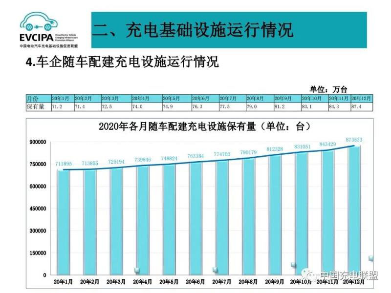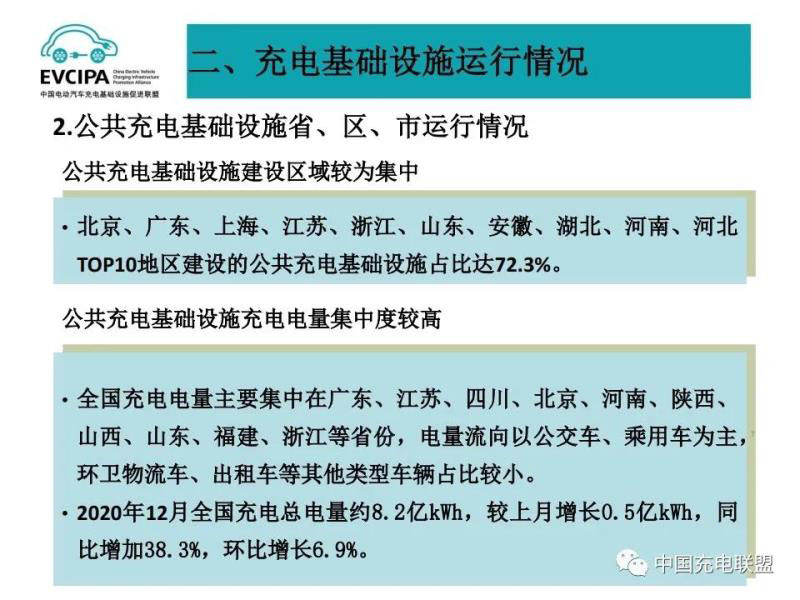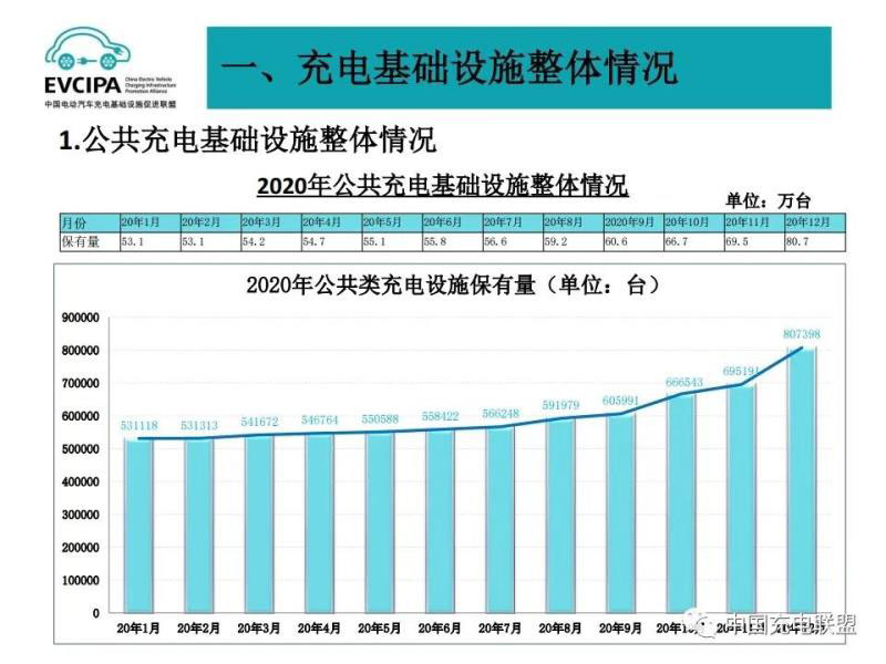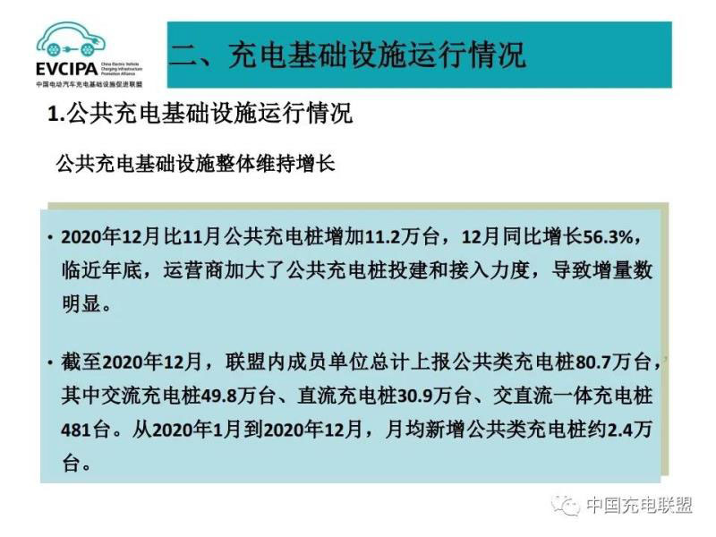 1、公共充電基礎(chǔ)設(shè)施運行情況,2020年12月比11月公共充電樁增加11.2萬臺,12月同比增長56.3%,臨近年底,運營商加大了公共充電樁投建和接入力度,導致增量數(shù)明顯。截至2020年12月,聯(lián)盟內(nèi)成員單位總計上報公共類充電樁80.7萬臺,其中交流充電樁49.8萬臺、直流充電樁30.9萬臺、交直流一體充電樁481臺。從2020年1月到2020年12月,月均新增公共類充電樁約2.4萬臺。