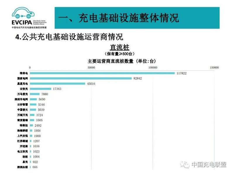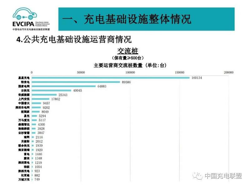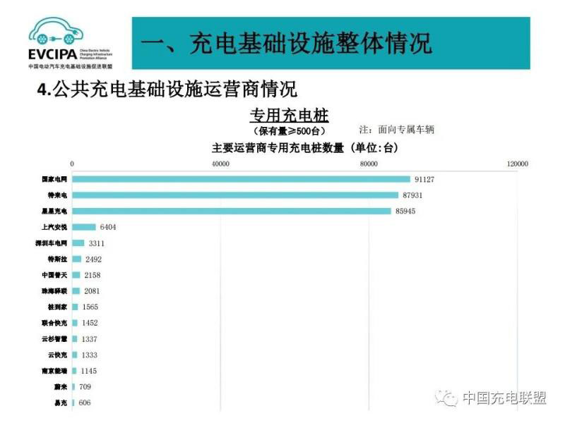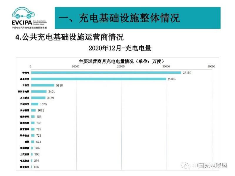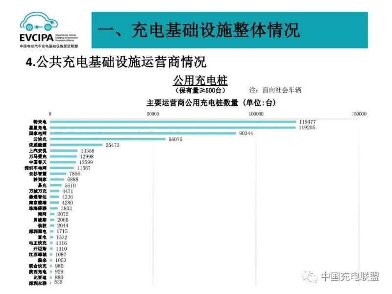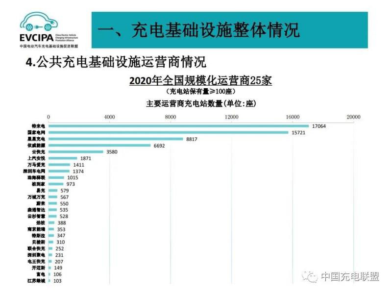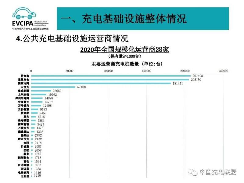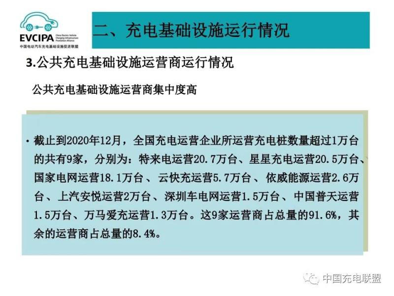 3、公共充電基礎(chǔ)設(shè)施運營商運行情況,截止到2020年12月,全國充電運營企業(yè)所運營充電樁數(shù)量超過1萬臺的共有9家,分別為:特來電運營20.7萬臺、星星充電運營20.5萬臺、國家電網(wǎng)運營18.1萬臺、云快充運營5.7萬臺、依威能源運營2.6萬臺、上汽安悅運營2萬臺、深圳車電網(wǎng)運營1.5萬臺、中國普天運營1.5萬臺、萬馬愛充運營1.3萬臺。這9家運營商占總量的91.6%,其余的運營商占總量的8.4%。