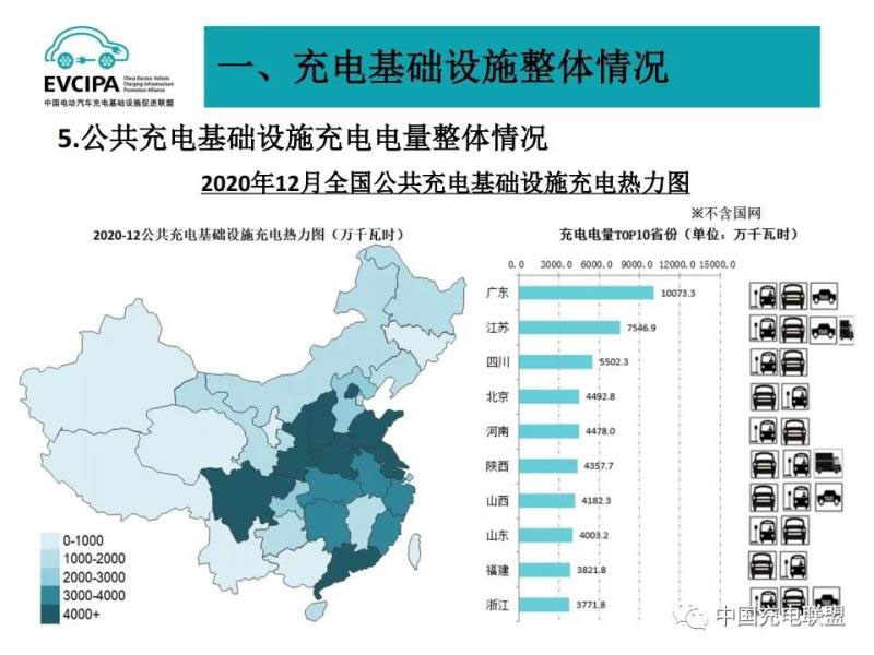 2、公共充電基礎(chǔ)設(shè)施省、區(qū)、市運行情況,北京、廣東、上海、江蘇、浙江、山東、安徽、湖北、河南、河北TOP10地區(qū)建設(shè)的公共充電基礎(chǔ)設(shè)施占比達72.3%。全國充電電量主要集中在廣東、江蘇、四川、北京、河南、陜西、山西、山東、福建、浙江等省份,電量流向以公交車、乘用車為主,環(huán)衛(wèi)物流車、出租車等其他類型車輛占比較小。2020年12月全國充電總電量約8.2億kWh,較上月增長0.5億kWh,同比增加38.3%,環(huán)比增長6.9%。
