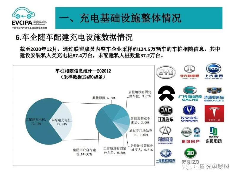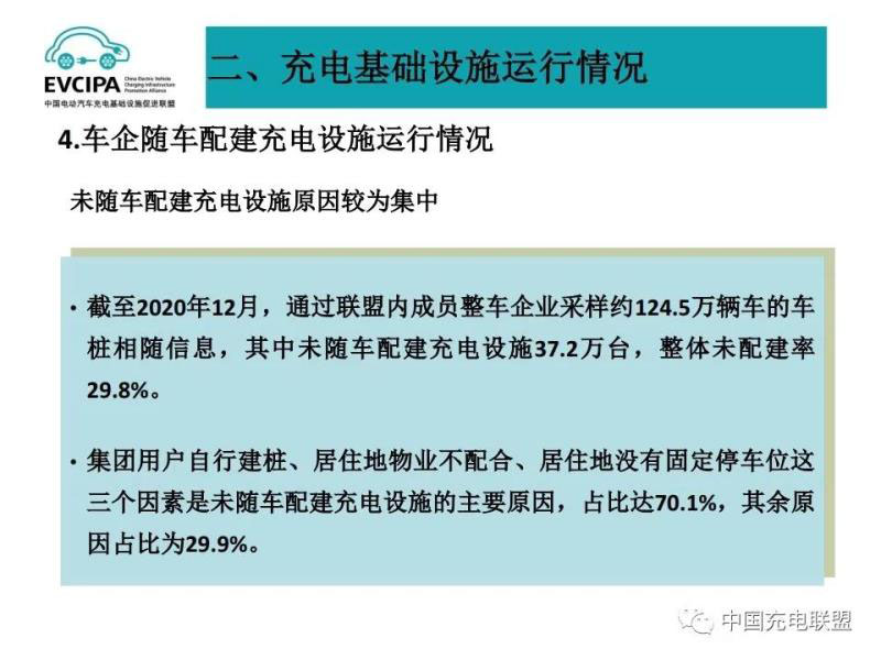 4、車企隨車配建充電設(shè)施運行情況,截至2020年12月,通過聯(lián)盟內(nèi)成員整車企業(yè)采樣約124.5萬輛車的車樁相隨信息,其中未隨車配建充電設(shè)施37.2萬臺,整體未配建率29.8%。集團用戶自行建樁、居住地物業(yè)不配合、居住地沒有固定停車位這三個因素是未隨車配建充電設(shè)施的主要原因,占比達70.1%,其余原因占比為29.9%。