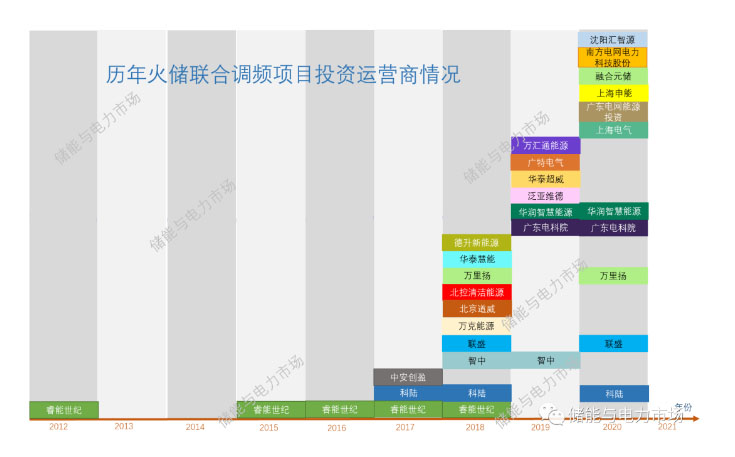 按照儲能項目的招投標結果公布的時間點,統計了不同年份火儲聯合調頻領域的投資/運營/集成廠家,如下圖。