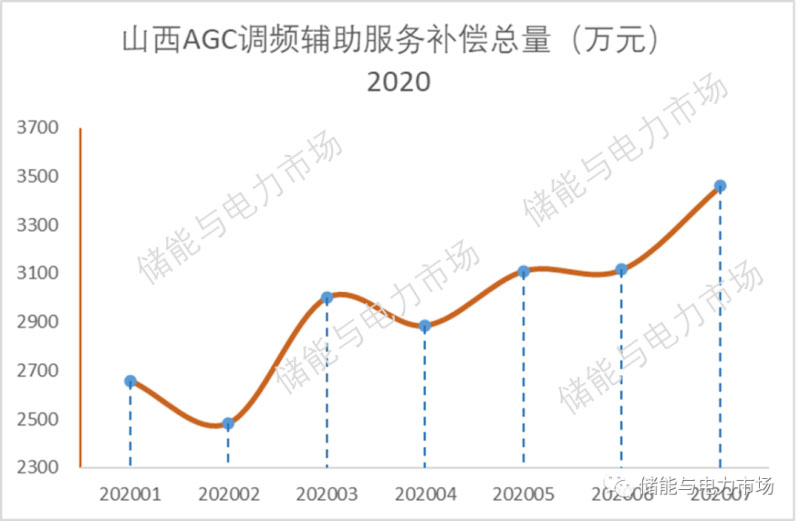 山西2020年1-7月份,月均補償額2959萬元。進入冬天后,由于調頻資源缺乏,山西的結算價格出現了一撥10元/MW以上的高峰,甚至15元/MW,預計全年數據公布,2020年山西調頻輔助服務月均補償額會有一定上升。