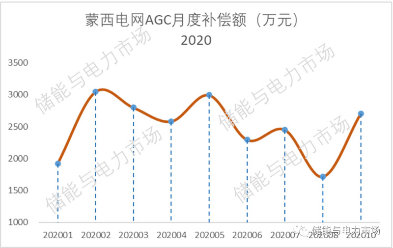 蒙西調頻輔助服務補償額自2019年年中高位跌落后,一直維持在3000萬以下的補償總額。2020年1-10月月均補償2501萬元。