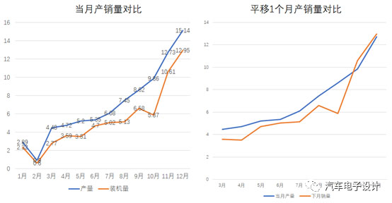 圖3 中國動力電池的產(chǎn)銷量對比和平移的效果