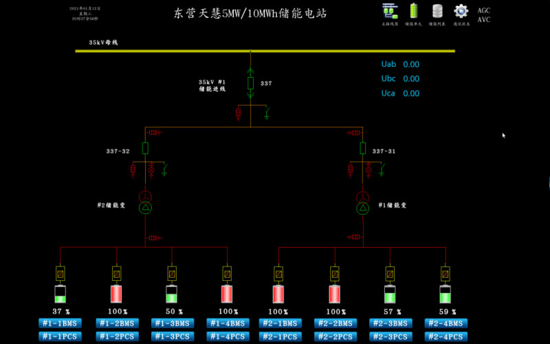 山東東營天慧漁光互補光伏項目位于山東省東營市墾利區(qū)境內(nèi),地勢平坦開闊,光照資源豐富,交通便利,是良好的光伏發(fā)電選址。項目總裝機規(guī)模達49MW,建成后年發(fā)電量將達6600萬度,年節(jié)約煤炭消費2.65萬噸。長園深瑞提供的5MW/10MWh預制艙式儲能系統(tǒng)由8臺PRS-7563 630kW儲能變流器經(jīng)過一體式升壓艙接入35kV母線,每臺儲能變流器對下接1.25MWh儲能電池。儲能監(jiān)控系統(tǒng)由長園深瑞PRS-3000儲能能量管理系統(tǒng)(EMS)和PRS-3201B儲能協(xié)調(diào)控制器組成。該5MW/10MWh預制艙式儲能系統(tǒng)采用PCS協(xié)調(diào)統(tǒng)一控制架構(gòu),采用“集中監(jiān)控+PCS協(xié)調(diào)控制“的模式,實現(xiàn)全站PCS功率快速協(xié)調(diào)控制、一次調(diào)頻、AGC跟蹤、AVC控制及發(fā)電功率平滑等功能,并納入山東省電網(wǎng)統(tǒng)一調(diào)度。