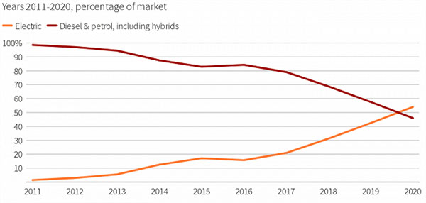 同樣公布2020年國家汽車銷量的國家還有挪威。近日據(jù)挪威公路聯(lián)合會(OFV)發(fā)布的最新數(shù)據(jù)顯示,2020年該國電動車銷量占比達到54.3%,高于2019年的42.1%,成為全世界首個全年電動車銷量占比過半的國家。