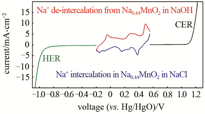 對錳酸鈉電極進(jìn)行線性伏安掃描測試,如圖8所示,其氧化還原峰正好位于HER和CER的中間區(qū)域。錳酸鈉在水系溶液中具有良好的鈉離子嵌入脫出能力,因此非常適合作為ECPBs。