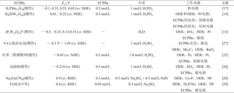 表1中給出了幾種典型的溶液態(tài)ECPBs,以及它們在分步法制氫實(shí)驗(yàn)中的關(guān)鍵的技術(shù)參數(shù)。