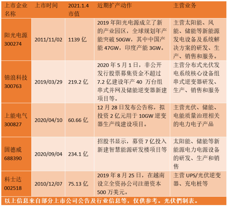 逆變器領域強有力的增量空間,也得到了資本市場的認可,2019年以來錦浪科技、上能電氣、固德威等陸續(xù)上市,市值突飛猛進,而逆變器龍頭股陽光電源的市值逾股價更是一路高漲,2020年突破了1000億人民幣,成為國內首個千億市值的逆變器企業(yè)。另一方面,國內逆變器企業(yè)陸續(xù)上市之后,將在資金方面形成強有力的支撐,更有利于海外市場的拓展與市占率的提升。