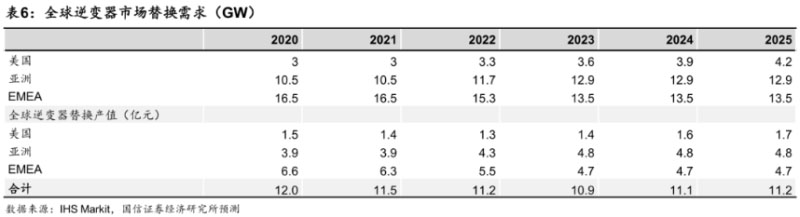 據國信證券分析,全球光伏新增裝機在2011年首次突破31GW,以逆變器更換周期為10年計算,預計未來五年每年光伏逆變器更換需求穩(wěn)定在30GW左右,按照各地工商業(yè)分布式的單價測算每年更換需求產值接近10億元人民幣。
