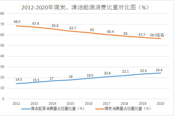 《中華人民共和國(guó)2019年國(guó)民經(jīng)濟(jì)和社會(huì)發(fā)展統(tǒng)計(jì)公報(bào)》顯示,2019年煤炭消費(fèi)量占能源消費(fèi)總量的57.7%,比上年下降1.5個(gè)百分點(diǎn);天然氣、水電、核電、風(fēng)電等清潔能源消費(fèi)量占能源消費(fèi)總量的23.4%,上升1.3個(gè)百分點(diǎn)。由此可知,2020年天然氣、水電、核電、風(fēng)電等清潔能源消費(fèi)量占能源消費(fèi)總量的比重已提高到24.4%左右,而煤炭的消費(fèi)比重進(jìn)一步降至57%以內(nèi)。