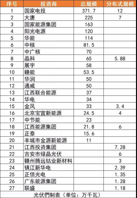 光伏們根據(jù)對(duì)594個(gè)入庫(kù)光伏項(xiàng)目經(jīng)過(guò)梳理后發(fā)現(xiàn),開(kāi)發(fā)規(guī)模TOP5的企業(yè),其入庫(kù)項(xiàng)目均超1GW,以國(guó)家電投、大唐、中核、華能、中廣核等為代表的央企仍是光伏電站開(kāi)發(fā)的主力軍,而民營(yíng)企業(yè)則由陽(yáng)光電源、晶科領(lǐng)銜。除上述典型代表企業(yè)外,江西省能源集團(tuán)以及贛能股份等省屬地方投資企業(yè)也斬獲了約800MW的光伏項(xiàng)目。具體情況見(jiàn)下表格: