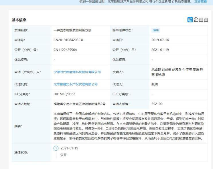 其中第一條公開號(hào)為CN112242556A,專利摘要顯示,本申請(qǐng)?zhí)峁┝艘环N固態(tài)電解質(zhì)的制備方法,包括:將鋰前體、中心原子配體分散于有機(jī)溶劑中,形成反應(yīng)初混液;將硼酸酯分散于有機(jī)溶劑中,形成改性溶液;將反應(yīng)初混液與改性溶液混合,干燥,得到初始產(chǎn)物;對(duì)初始產(chǎn)物研磨、冷壓、熱處理得到固態(tài)電解質(zhì)。在本申請(qǐng)所提供的制備方法中,制得的硫化物固態(tài)電解質(zhì)的離子電導(dǎo)率得到顯著提升,從而也利于全固態(tài)電池的能量密度的發(fā)揮。