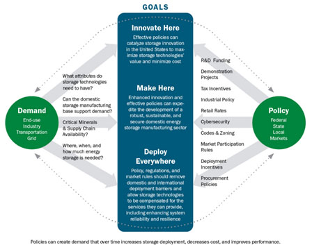 國家政策影響著ESGC的三個主要挑戰(zhàn):美國創(chuàng)新、美國制造、全球部署。圖2顯示了有效的儲能政策如何能夠加速創(chuàng)新,加強制造并消除市場障礙,實現(xiàn)規(guī)模經(jīng)濟的同時,降低能源存儲成本。