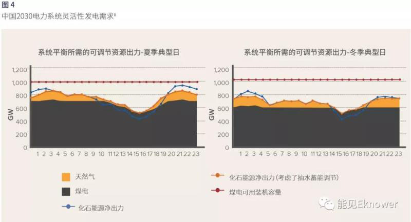 在實(shí)現(xiàn)全國(guó)范圍調(diào)度、省間充分互連的情景下,即使核電和水電出力在日內(nèi)完全不具備靈活性,中國(guó)能夠?qū)崿F(xiàn)2030年零碳投資情境中非水可再生能源占比28%的目標(biāo)。圖3展示了零碳投資情境中2030年夏季和冬季典型日的全國(guó)供需平衡模擬圖。考慮所有非靈活調(diào)度的資源出力后,火電將在下午時(shí)段降低出力,傍晚和夜間提高出力來(lái)幫助平衡太陽(yáng)能發(fā)電。通過(guò)抽水蓄能將小部分夜間發(fā)電需求轉(zhuǎn)移到白天,結(jié)合靈活性較高的燃?xì)獍l(fā)電來(lái)滿足晚上和夜間的部分調(diào)峰需求,可進(jìn)一步減少對(duì)煤電的靈活性需求。即使在現(xiàn)有的煤電廠靈活性水平下,也完全可以實(shí)現(xiàn)系統(tǒng)的平衡。
