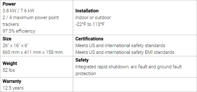有新買家表示,新款逆變器已能夠與特斯拉的 Solar Roof 光伏裝置一起安裝,感興趣的朋友可訪問(wèn)官方網(wǎng)站獲取詳情。以下是特斯拉列出的某些關(guān)鍵規(guī)格: