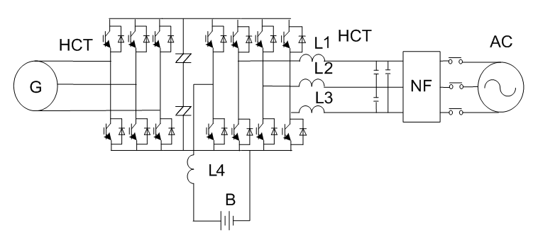 燃氣輪機利用氣體作為工質(zhì)在燃燒室里燃燒,將燃料的化學(xué)能轉(zhuǎn)變?yōu)闅怏w的內(nèi)能。在汽缸里,氣體的內(nèi)能轉(zhuǎn)變?yōu)闅怏w的動能,燃氣高速噴出,沖擊葉輪轉(zhuǎn)動,葉輪驅(qū)動主軸,再帶動發(fā)電機旋轉(zhuǎn)產(chǎn)生電能。為了獲得較高的發(fā)電效率,燃氣輪機的主軸轉(zhuǎn)速通常達數(shù)萬轉(zhuǎn)/分,其產(chǎn)生的電能頻率達數(shù)百赫茲,無法與電網(wǎng)直接相連,必須通過交直、直交變換才能聯(lián)網(wǎng)或供給用電設(shè)備。再加上這類裝置需要電動啟動,變換裝置還需具備雙向流通的能力。這就使得其中變流器具有較復(fù)雜的功能,典型電路示例如圖4所示。圖中,電池B用作能量緩沖及無電網(wǎng)送電時始動之用。