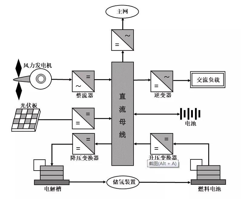 氫研究所(HRI)開發(fā)了一套系統(tǒng),將可再生能源系統(tǒng)產(chǎn)生的能量以氫氣形式進行儲存,如圖3所示。該系統(tǒng)包括直流負載母線、風(fēng)力發(fā)電機、太陽能電池板、燃料電池系統(tǒng)和氫轉(zhuǎn)換系統(tǒng)。連接到直流母線的降壓DC-DC變換器用于將母線電壓降低到適合電解的電壓水平。電解水獲得的氫氣被儲存在一個特殊的儲存管中。儲存的氫氣通過燃料電池(PEMFC)轉(zhuǎn)換為電能。燃料電池產(chǎn)生的能量通過升壓DC-DC變換器傳輸?shù)较到y(tǒng)直流母線。