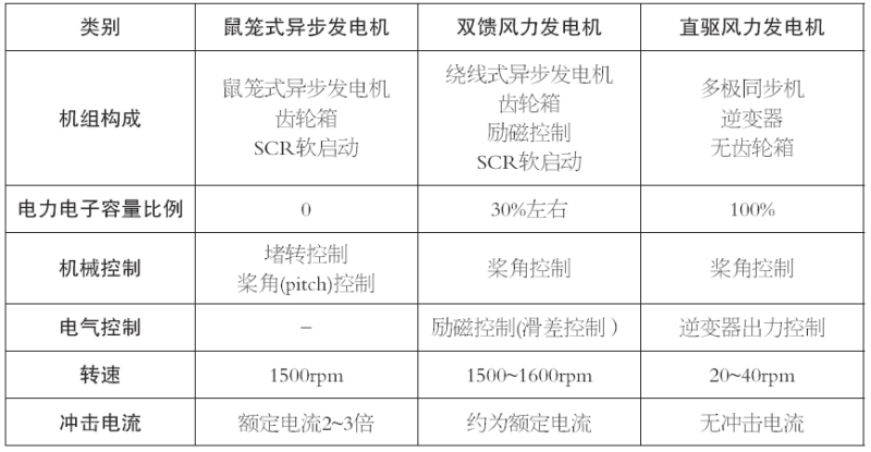 風(fēng)能具有波動性和隨機性,無法存儲,因而無法像傳統(tǒng)能源利用中那樣,在保持一次能源相對穩(wěn)定的情況下產(chǎn)生電能,這就要求風(fēng)力發(fā)電系統(tǒng)具有很強的調(diào)節(jié)能力和適應(yīng)性,這正是柔性化技術(shù)的核心。風(fēng)力發(fā)電機按異步型和同步型分類,可以分為鼠籠式異步發(fā)電機、雙饋風(fēng)力發(fā)電機、直驅(qū)風(fēng)力發(fā)電機三種,其機組控制特性構(gòu)成對比如表2所示。