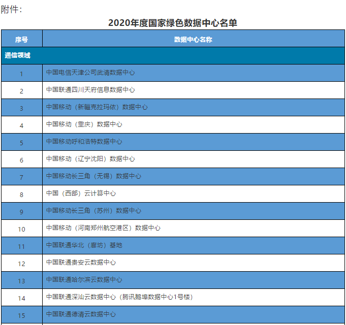 公告指出,為加快綠色數(shù)據(jù)中心建設(shè),引領(lǐng)數(shù)據(jù)中心走高效、低碳、集約、循環(huán)的綠色發(fā)展道路,經(jīng)申報單位自評價、第三方機(jī)構(gòu)評價、省級工業(yè)和信息化主管部門及相關(guān)單位推薦、專家評審、公示等程序,工業(yè)和信息化部、國家發(fā)展改革委、商務(wù)部、國管局、銀保監(jiān)會、國家能源局確定了60家2020年度國家綠色數(shù)據(jù)中心名單。