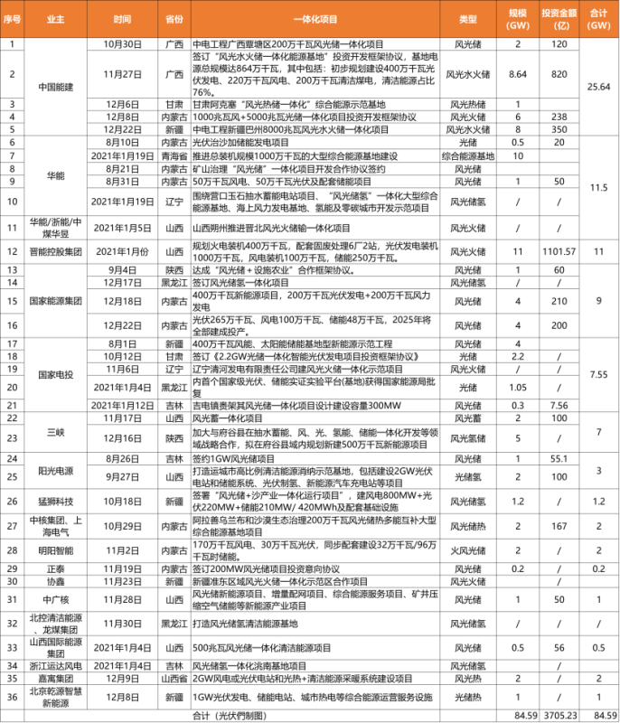 據(jù)光伏們根據(jù)公開(kāi)資料不完全統(tǒng)計(jì),2020年下半年至今有36個(gè)一體化項(xiàng)目簽約落地,規(guī)劃總規(guī)模近85GW,投資總額超過(guò)3700億,且因地制宜,形式多樣,包括風(fēng)光水火儲(chǔ)、風(fēng)光儲(chǔ)、風(fēng)光儲(chǔ)氫一體化等等。